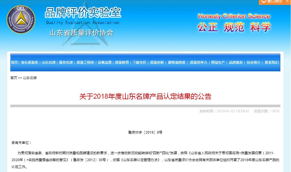 經(jīng)企業(yè)自愿申報(bào)、各市推薦、資格審查、材料(網(wǎng)絡(luò))認(rèn)定、現(xiàn)場(chǎng)核查、企業(yè)質(zhì)量信用評(píng)價(jià)等認(rèn)定環(huán)節(jié)的層層篩選及征求意見和社會(huì)公示等工作程序,確定了2018年度“山東名牌產(chǎn)品”名單。