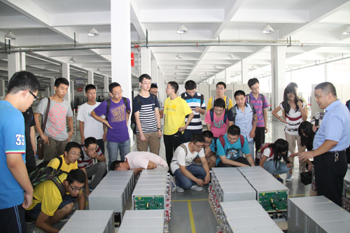 公司技術中心負責人帶領學生們深入車間參觀了解高壓變頻器、高壓動態(tài)無功補償產(chǎn)品和變流器等三大主導產(chǎn)品的生產(chǎn)、裝配、檢測等各個工藝流程。公司先進生產(chǎn)線的車間讓同學們眼前一亮,面對眾多先進的生產(chǎn)、檢測、試驗儀器設備,使得同學們駐足觀看,不時詢問。并對新風光公司規(guī)模的不斷發(fā)展壯大、蒸蒸日上的強勁發(fā)展勢頭贊嘆不已。