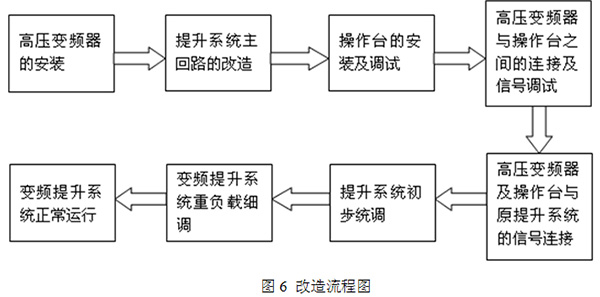(3)接下來進行操作臺的固定安裝,連接操作臺與變頻器之間的連線,調(diào)試操作臺與變頻器的信號傳遞,正常后把變頻器和操作臺聯(lián)入到原操作系統(tǒng)中統(tǒng)調(diào),帶重載調(diào)試這是改造中的重點部分。整個改造工程流程如圖6所示: