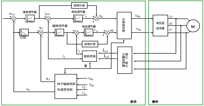 新風(fēng)光JD-BP37-T系列高性能高壓變頻調(diào)速產(chǎn)品,以高速DSP(TMS320F2812)為控制核心,采用矢量控制技術(shù),融合了能量回饋技術(shù),以及IGBT大電流驅(qū)動(dòng)技術(shù),是新一代高性能完美無(wú)諧波高壓變頻調(diào)速產(chǎn)品的典型代表。矢量控制功能使得異步電機(jī)啟動(dòng)轉(zhuǎn)矩大,動(dòng)態(tài)轉(zhuǎn)矩響應(yīng)好,調(diào)速精度高。能量回饋技術(shù)的應(yīng)用,使得功率單元串聯(lián)型高壓變頻器具備了四象限運(yùn)行能力,能量可以在電網(wǎng)和電機(jī)之間雙向流動(dòng)。矢量控制技術(shù)原理如圖1所示。