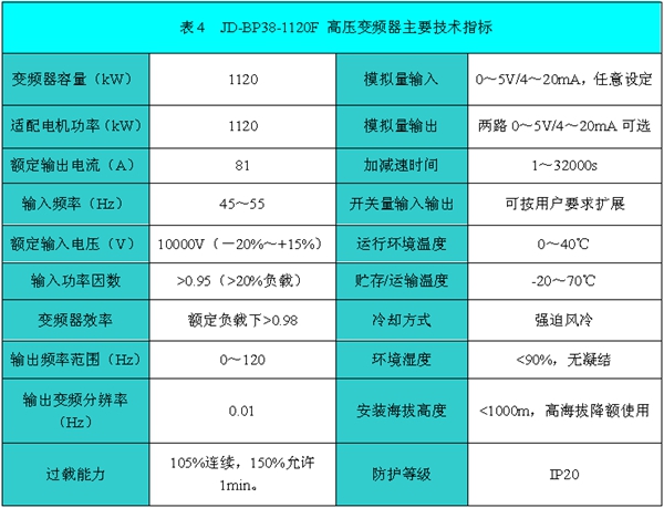 JD-BP38-1120F高壓變頻器技術(shù)指標如表4所示。
