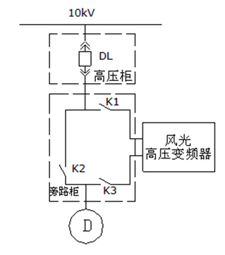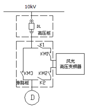 在風(fēng)機(jī)改造過程中,高溫風(fēng)機(jī)(2500kW/10kV、1套)采用“一拖一”控制加自動(dòng)旁路柜,窯頭排風(fēng)機(jī)(560kW/10kV、1套)、窯尾排風(fēng)機(jī)(1400kW/10kV、1套)、煤磨排風(fēng)機(jī)(710kW/10kV、1套和循環(huán)風(fēng)機(jī)(1800kW/10kV、2套)采用“一拖一”控制加手動(dòng)旁路柜。