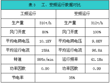 為了對窯尾高溫風機系統(tǒng)變頻改造后的效果進行評價,在系統(tǒng)投入正常運行后對設(shè)備實際使用和節(jié)電情況進行了測定和數(shù)據(jù)分析。工、變頻生產(chǎn)工況基本相同,隨機抽取一個正常工作日,將系統(tǒng)切換工頻運行采用風門調(diào)節(jié)風量,網(wǎng)側(cè)記錄運行數(shù)據(jù),然后將系統(tǒng)切換變頻運行,記錄運行數(shù)據(jù),具體數(shù)據(jù)如下表3示:
