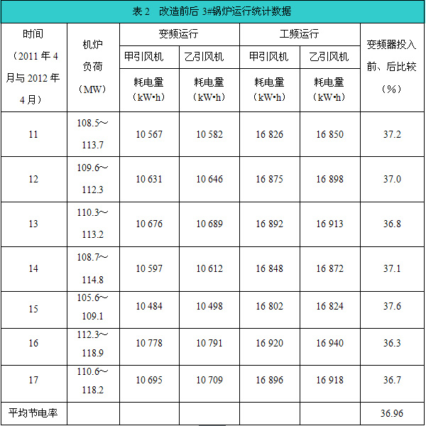 通過表2數(shù)據(jù)對比,從節(jié)電率分析,3#機組在發(fā)電負(fù)荷相同情況時,3#機組兩臺引風(fēng)機工頻運行每天平均耗電量33 753kW·h,3#機組兩臺引風(fēng)機變頻運行每天平均耗電量21 279kW·h,節(jié)約電量12 474kW·h,節(jié)電率為36.96%。