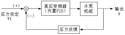由于永州市零陵區(qū)自來(lái)水公司,對(duì)用水負(fù)荷需要在實(shí)際運(yùn)行時(shí)進(jìn)行精確調(diào)整和測(cè)量,因此采用的是恒壓供水系統(tǒng),其工作原理如圖3所示,測(cè)量元件為壓力傳感器,將它設(shè)在水泵機(jī)組出水口,Vi為恒定供水壓力設(shè)定值,供水壓力V作為輸出量,構(gòu)成閉環(huán)控制系統(tǒng)。變頻器內(nèi)部的PLC采集供水壓力值V與用戶給定值Vi進(jìn)行比較和運(yùn)算,通過(guò)PID進(jìn)行調(diào)整,將結(jié)果轉(zhuǎn)換為頻率調(diào)節(jié)信號(hào)送至變頻器,直至達(dá)到供水壓力的給定值Vi。不管系統(tǒng)供水流量如何變化,供水壓力值V始終維持在給定壓力值Vi附近。