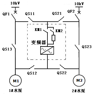 /10kV電機(jī))高壓變頻器,高壓變頻器采用“一拖二”手動(dòng)旁路方案。1#、2#水泵一次系統(tǒng)接線圖路如圖2所示,通過(guò)切換高壓隔離開(kāi)關(guān)把高壓變頻器切換到要運(yùn)行的水泵上去。高壓變頻器可以拖動(dòng)1#供水泵電動(dòng)機(jī)實(shí)現(xiàn)變頻運(yùn)行,也可以通過(guò)切換拖動(dòng)2#供水泵電動(dòng)機(jī)實(shí)現(xiàn)變頻運(yùn)行。兩側(cè)供水泵電動(dòng)機(jī)均具備工頻旁路功能。