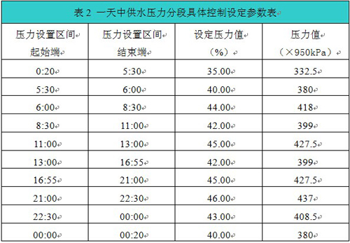 現(xiàn)場(chǎng)采用壓力閉環(huán)控制,每天分十個(gè)時(shí)間段來(lái)控制給定壓力,具體設(shè)定壓力分段如表2所示。