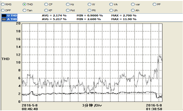 經(jīng)過認(rèn)真安裝調(diào)試,SVG裝置按用戶要求,2016年9月已投入正常運(yùn)行,現(xiàn)按功率因數(shù)自動(dòng)補(bǔ)償運(yùn)行,功率因數(shù)設(shè)定值為97%,投運(yùn)后工作正常,用戶十分滿意。根據(jù)用戶要求,在安裝調(diào)試完畢后對(duì)機(jī)械鑄造廠高壓側(cè)進(jìn)行了諧波補(bǔ)償效果并進(jìn)行了測(cè)試。