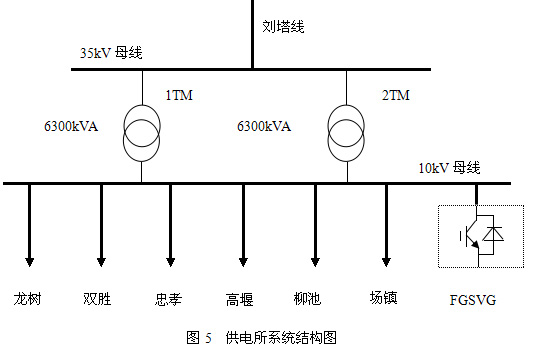 塔山供電所位于三臺(tái)縣東路的塔山場(chǎng)鎮(zhèn),現(xiàn)有6300kVA主變兩臺(tái),全年供電量2000多萬(wàn)kW·h。轄區(qū)35kV劉塔線路一條18.6公里,10kV線路共六條共計(jì)312.3公里,共計(jì)量用戶(hù)27905戶(hù),現(xiàn)在10kV母線上裝設(shè)2000kvar的SVG一臺(tái)。供電系統(tǒng)結(jié)構(gòu)如圖5所示。