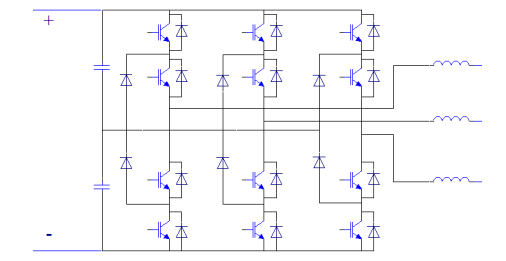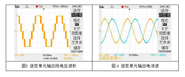 逆變裝置的單元采用三電平拓?fù)潆娐?,如圖2所示。逆變輸出電壓波形、輸出電流波形分別如圖3、4所示。