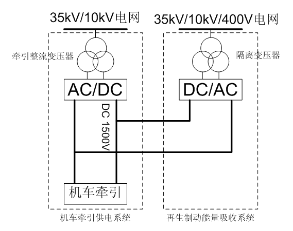 再生制動(dòng)能量吸收裝置是并聯(lián)在1500V/750V直流系統(tǒng)中,經(jīng)過逆變裝置變成交流,經(jīng)隔離變壓器輸入到電網(wǎng)(35kV/10kV/400V)。