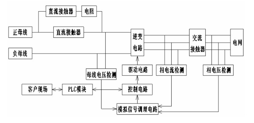 本設(shè)備在接收到總控裝置啟動(dòng)信號(hào),即啟動(dòng)/退出信號(hào)的無(wú)源常開結(jié)點(diǎn)閉合后,經(jīng)過控制回路動(dòng)作,送出啟動(dòng)完畢確認(rèn)信號(hào),即此無(wú)源常開結(jié)點(diǎn)閉合??偪匮b置檢測(cè)到啟動(dòng)完畢確認(rèn)信號(hào)后,根據(jù)母線電壓幅值給出開機(jī)結(jié)點(diǎn)信號(hào)。結(jié)點(diǎn)閉合逆變裝置IGBT瞬間開通,進(jìn)行能量回饋。逆變?cè)O(shè)備工作過程中,時(shí)刻接受總控裝置的控制信號(hào)并及時(shí)回復(fù)設(shè)備內(nèi)接觸器、各個(gè)單元的工作狀態(tài)信號(hào)。圖6為整機(jī)的控制原理圖。